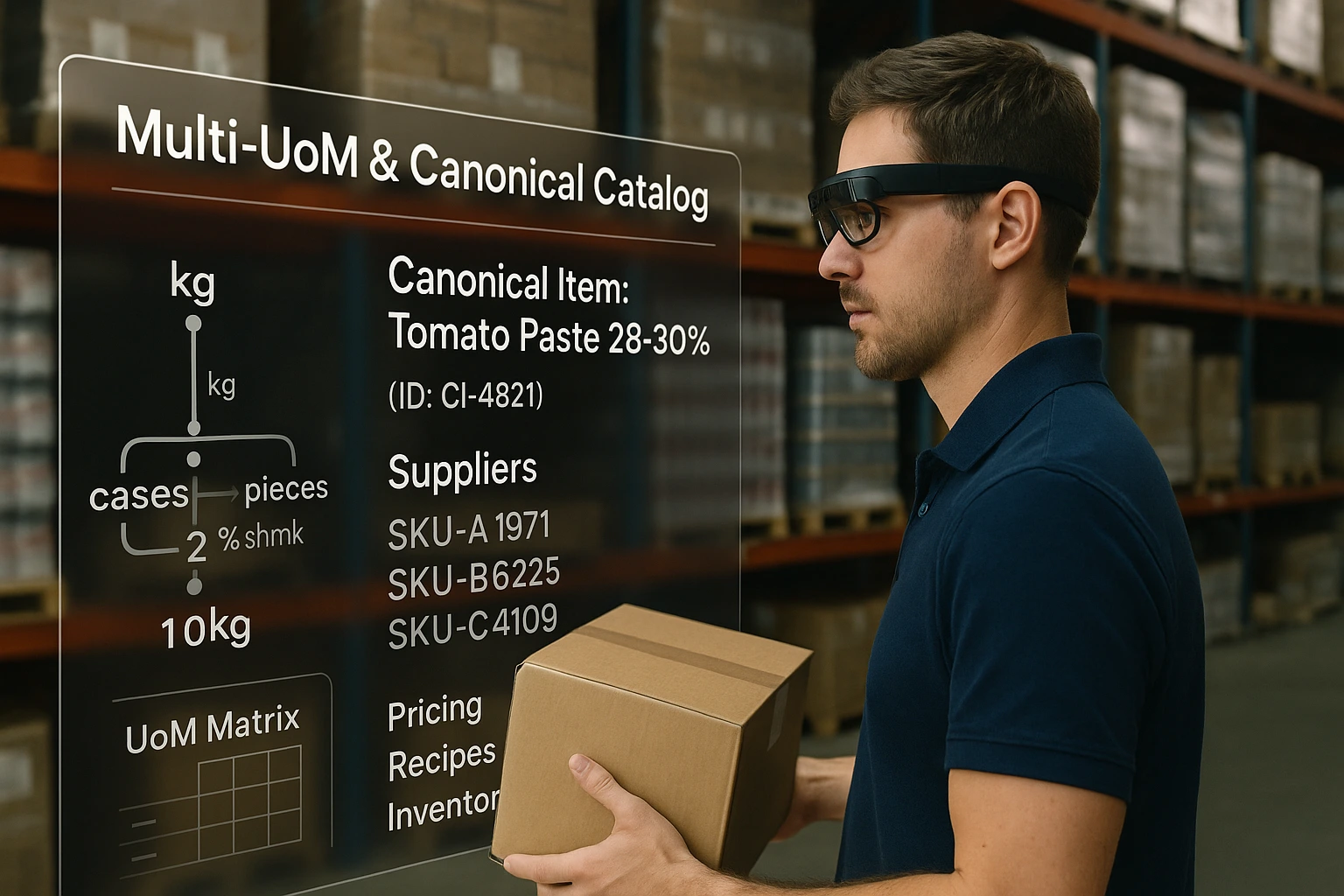 a single canonical model for items and pricing—clean catalogs, suppliers, and price lists.